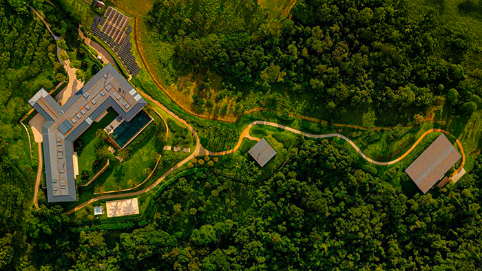 Localizada em um grande declive, em meio a uma reserva florestal, o projeto da Residência RDJ buscou mimetizar topograficamente o terreno no qual se insere. O objetivo era criar uma casa que, à primeira vista, parecesse térrea, mas que fosse lentamente se desdobrando através do subsolo e de outros pavilhões que compõem o percurso da sua descida.